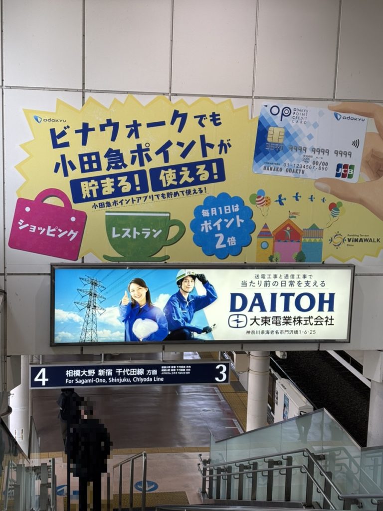 2025年11月1日より、小田急線「海老名駅」構内にて当社の 広告看板を掲出いたしました。 海老名駅は神奈川本社最寄りの主要駅であり、 多くの利用者が行き交う交通拠点です。 今回の掲出は、地域の皆さまに当社をより広く知っていただくことを 目的として行ったものです。 海老名駅をご利用の際は、 ぜひ当社看板をご覧いただければ幸いです。 今後も、地域に根ざした企業として、 積極的な情報発信に努めてまいります。
